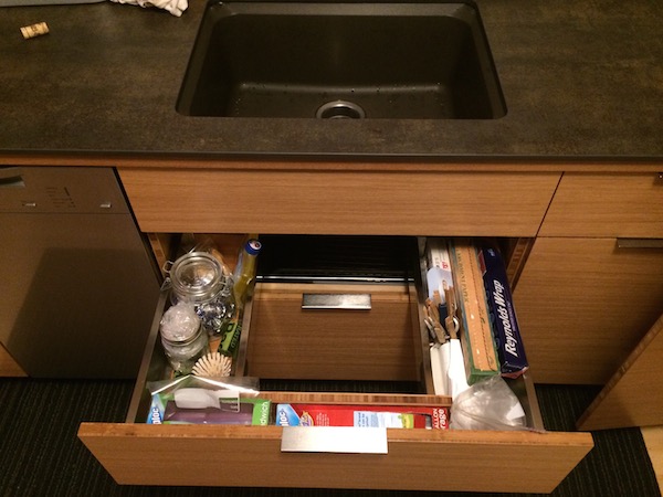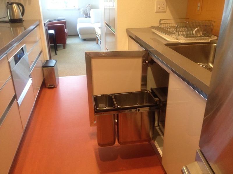 “The maple veneer cabinets [which have a pressboard core] are UltraCraft, the countertops are Zodiaq Quartz, and the floors are a high-quality/low-noise vinyl tile form Abbey Carpet El Cerrito. Cabinet hardware was special ordered through Belmont Hardware. Appliances are from Sears and Pacific Sales. Total cost was under $30K, including appliances. For the sink, I recommend the Blanco Performa line, which is designed to offer maximum volume and depth in constrained spaces.”