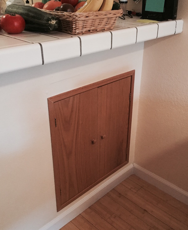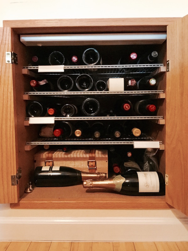 Patrice Brault writes: “[Here is] the wine cabinet I added in the dead corner of the kitchen, left from the dishwasher and adjacent to the kitchen sink. The volume is big enough to house another large appliance. I used about 60-70% of the space and came up with a wine cabinet that holds 60-70 bottles easily depending on bottle shape.”
